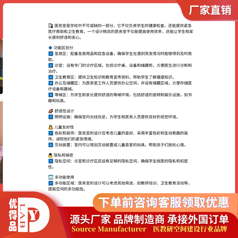 全系列家具选用环保耐用的优质材质,符合校园家具安全标准,结构设计人性化、做工精细,边角做安全防护处理,适配校园使用场景;同时可根据校医室、卫生室的空间面积、布局规划定制规格与款式,灵活适配不同院校的建设需求,一站式配齐无需多渠道采购,有效提升校园医疗设施的配置效率与使用体验,助力各类院校打造标准化、规范化的校园医疗保健空间。选专业产品就找优得品。